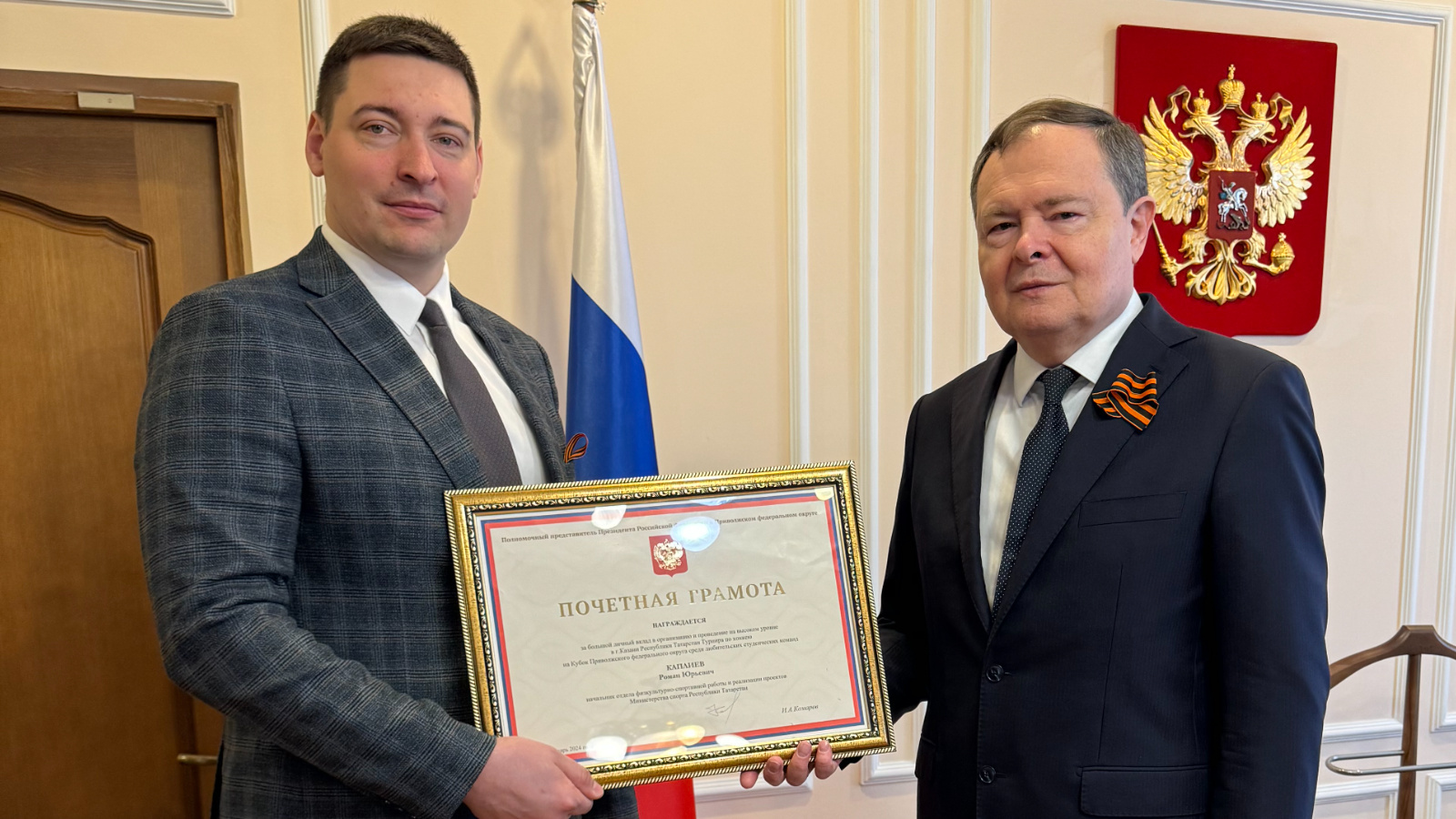 По поручению полномочного представителя Президента Российской Федерации в Приволжском федеральном округе Игоря Комарова Главный федеральный инспектор по Республике Татарстан Виктор Демидов вручил сегодня Почетную грамоту полномочного представителя Президента РФ в ПФО «За большой личный вклад в организацию и проведение на высоком уровне в г. Казани Республики Татарстан Турнира по хоккею на Кубок Приволжского федерального округа среди любительских студенческих команд» начальнику отдела физкультурно-спортивной работы и реализации проектов Министерства спорта Республики Татарстан Каплиеву Роману Юрьевичу.