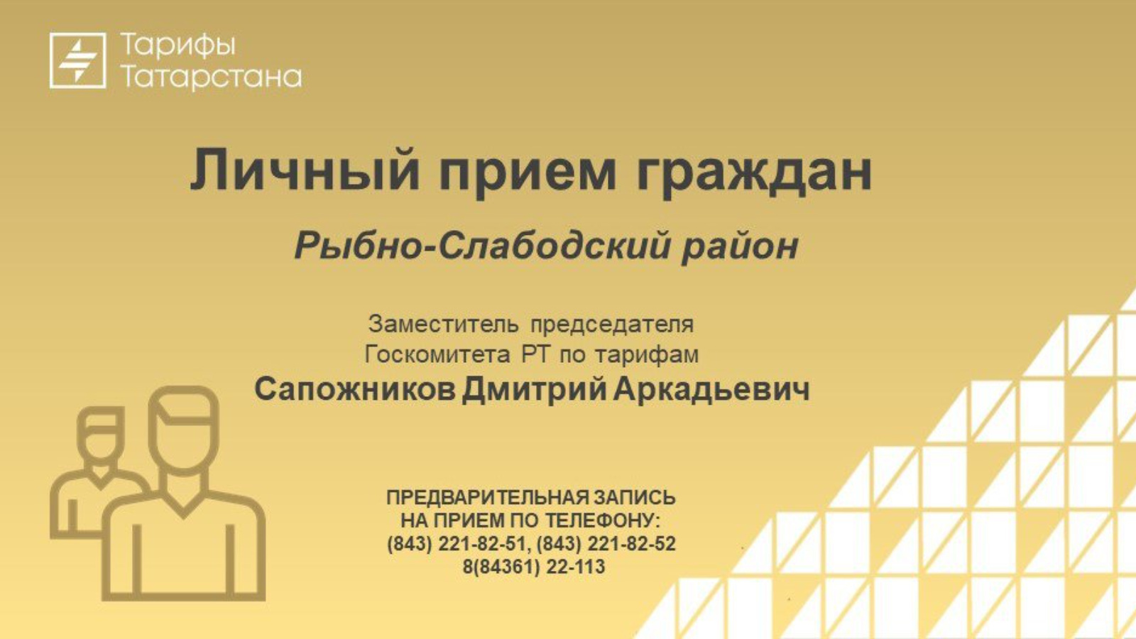 18 февраля 2025 года заместитель председателя Госкомитета РТ по тарифам Дмитрий Сапожников с рабочим визитом посетит Рыбно-Слободский муниципальный район, в ходе которого запланирован личный прием граждан по адресу: 422650, Республика Татарстан, Рыбно-Слободский муниципальный район, пгт.Рыбная Слобода, ул.Ленина, 48.