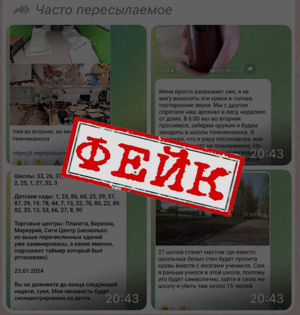 Пресс-секретарь Рамиля Муллина Яна Енькова в своем телеграм-канале «Пресек, ответь!» сообщила, что в социальных сетях Нижнекамска активно начала распространяться информация о якобы готовящемся теракте на территории учебных заведений города. Информация не соответствует действительности, это фейк! Просим сохранять спокойствие и не поддаваться панике.