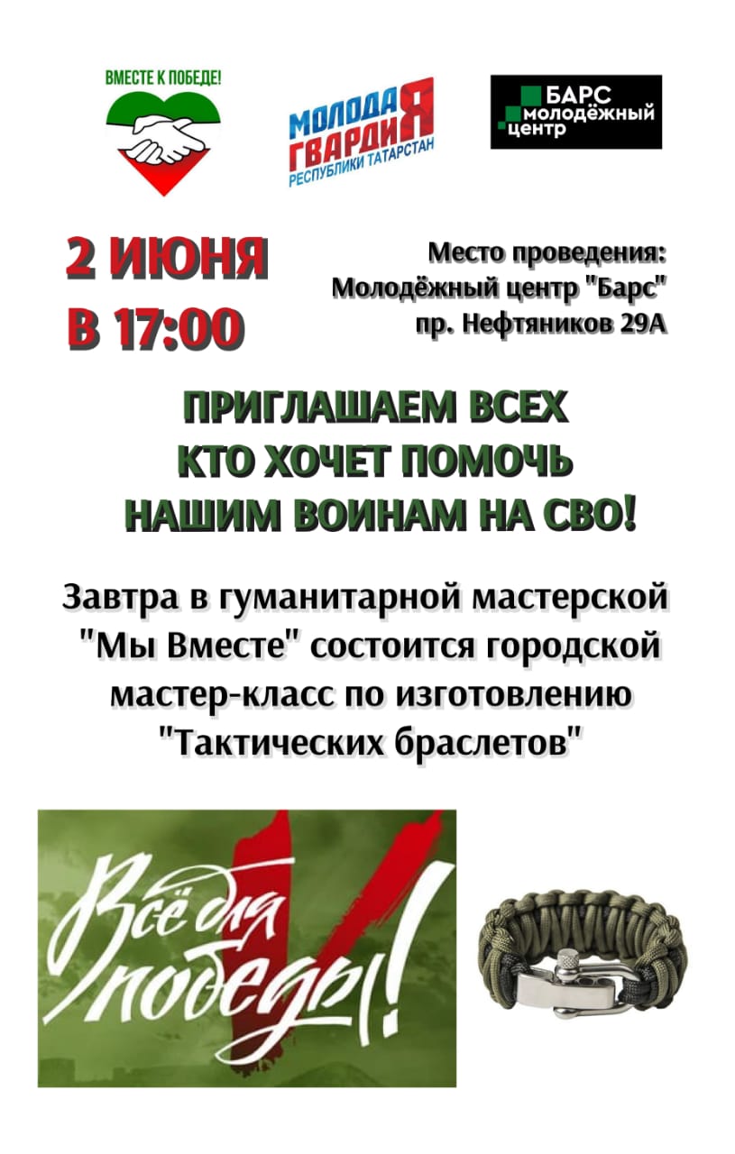 Приглашаем всех, кто хочет помочь нашим воинам участвующих в СВО. Сегодня, 2 июня в 17:00 в гуманитарной мастерской "Мы Вместе" будет проходить городской мастер-класс по изготовлению "Тактических браслетов".