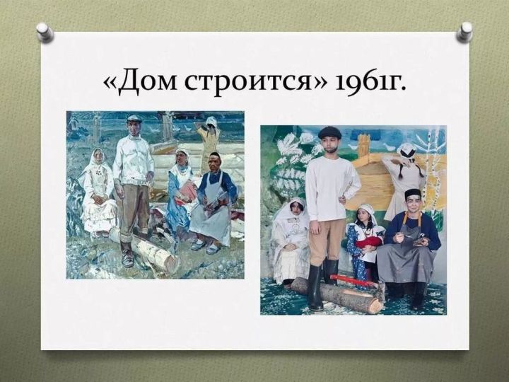 Для инсценировки была выбрана картина Маснави Хаертдинова «Дом строится», выполненная мастером в 1961 году.