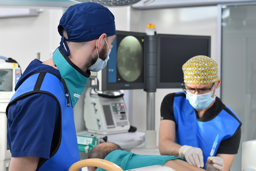 «При проведении процедуры, в эпидуральное пространство под контролем С-дуги вводят лекарственную смесь, состоящую из местного анестетика и стероида длительного действия. Перед введением противовоспалительного препарата, мы применяем специальное контрастное вещество, чтобы убедиться в безопасности и точности процедуры. Раствор малого объема (всего лишь около 3-5 мл) распространяется периневрально, эпидурально и попадает непосредственно в зону сдавления нервных структур» - рассказал врач-нейрохирург Университетской клиники Андрей Вершинин.